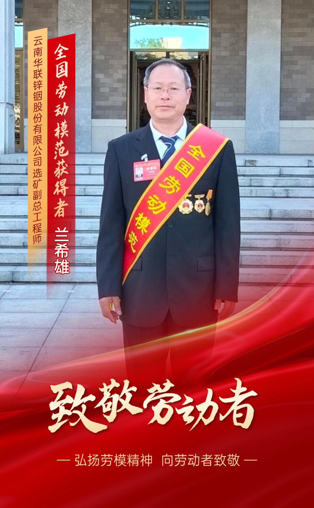 蘭希雄,錫業股份所屬華聯鋅銦公司選礦副總工程師,先后榮獲“全國五一勞動獎章”“云南省勞動模范”“云南省產業技術領軍人才”“云南省最美職工年度人物”等多項榮譽,享受國務院政府特殊津貼。