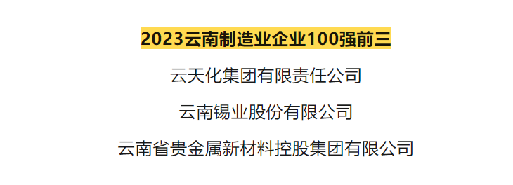 近日,由云南省企業聯合會、云南省企業家協會公開發布的“2023云南企業100強”新鮮出爐。錫業股份位列2023云南高新技術企業100強第1位,2023云南制造業企業100強第2位。