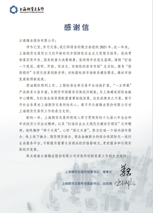 2022年的市場環境更趨復雜嚴峻和不確定,回顧2021年與上期所風雨同舟,我們展望2022年與上期所進一步加強合作,推動錫產業高質量發展再創輝煌。