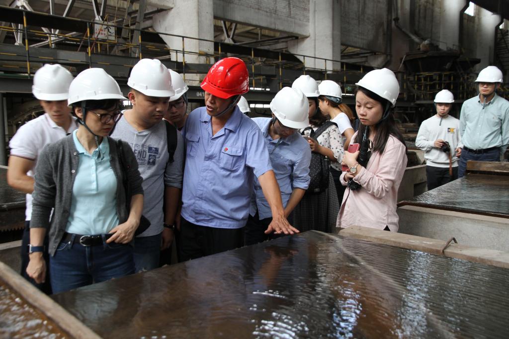 學(xué)員們先后參觀了熔煉車間精礦倉、反射爐舊址、頂吹爐主控室、精煉車間電熱連續(xù)結(jié)晶機(jī)、圓盤自動(dòng)澆鑄機(jī)及錫庫,詳細(xì)了解了錫冶煉流程的設(shè)備原理、操作控制、工藝原理、入爐原料品位等方面情況。