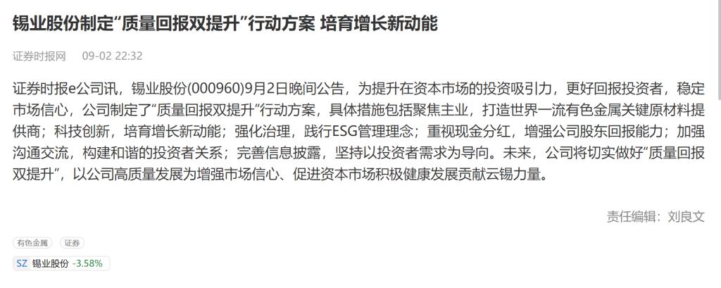 證券時報網(wǎng):錫業(yè)股份制定“質(zhì)量回報雙提升”行動方案 培育增長新動能