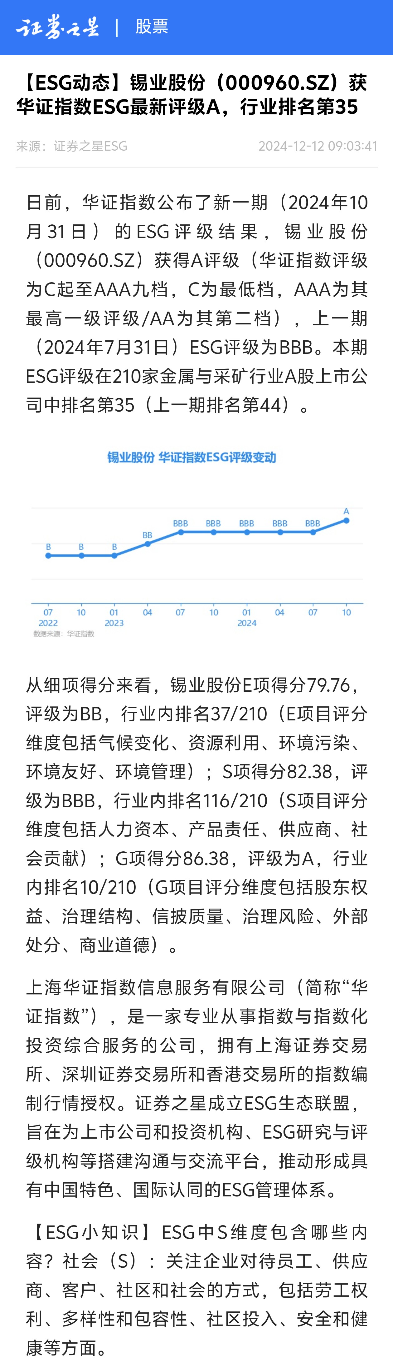 證券之星:錫業股份獲華證指數ESG最新評級A,行業排名第35