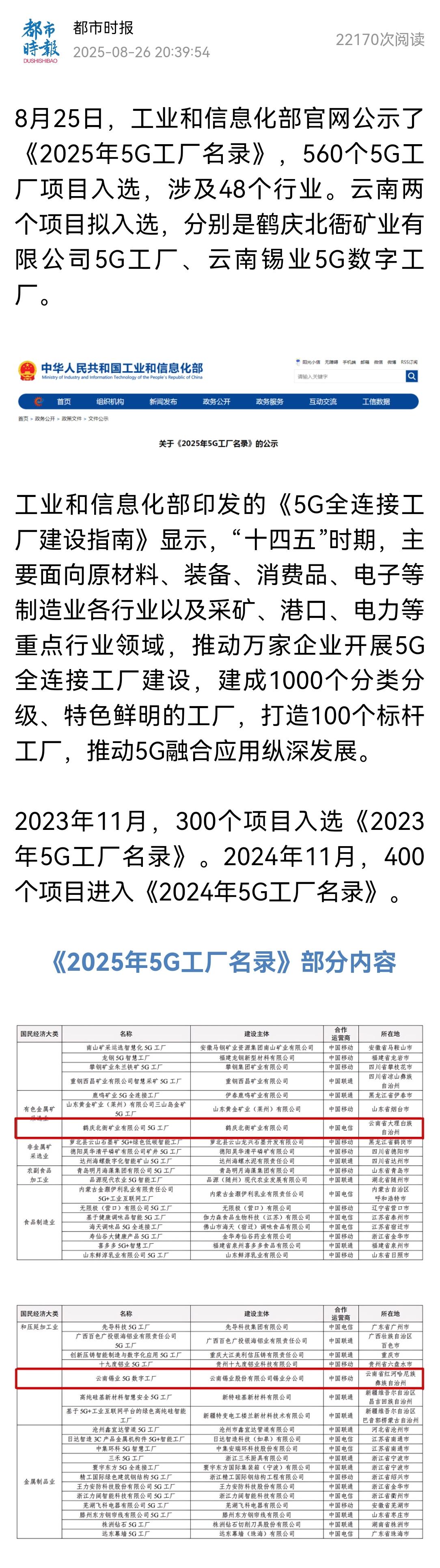 都市時報:云南兩個項目擬入選!2025年5G工廠名錄公示
